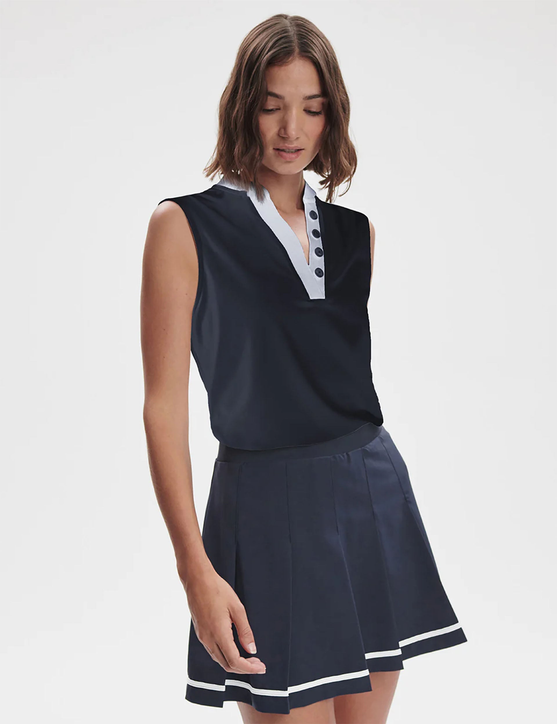 Ace your tennis game in the Shelby Performance Tank, featuring a mock button placket and side-split hem for a stylish edge on the court. Its moisture-wicking, lightweight fabric with wide armholes keeps you cool, while the V-neck adds a chic touch to every powerful swing.